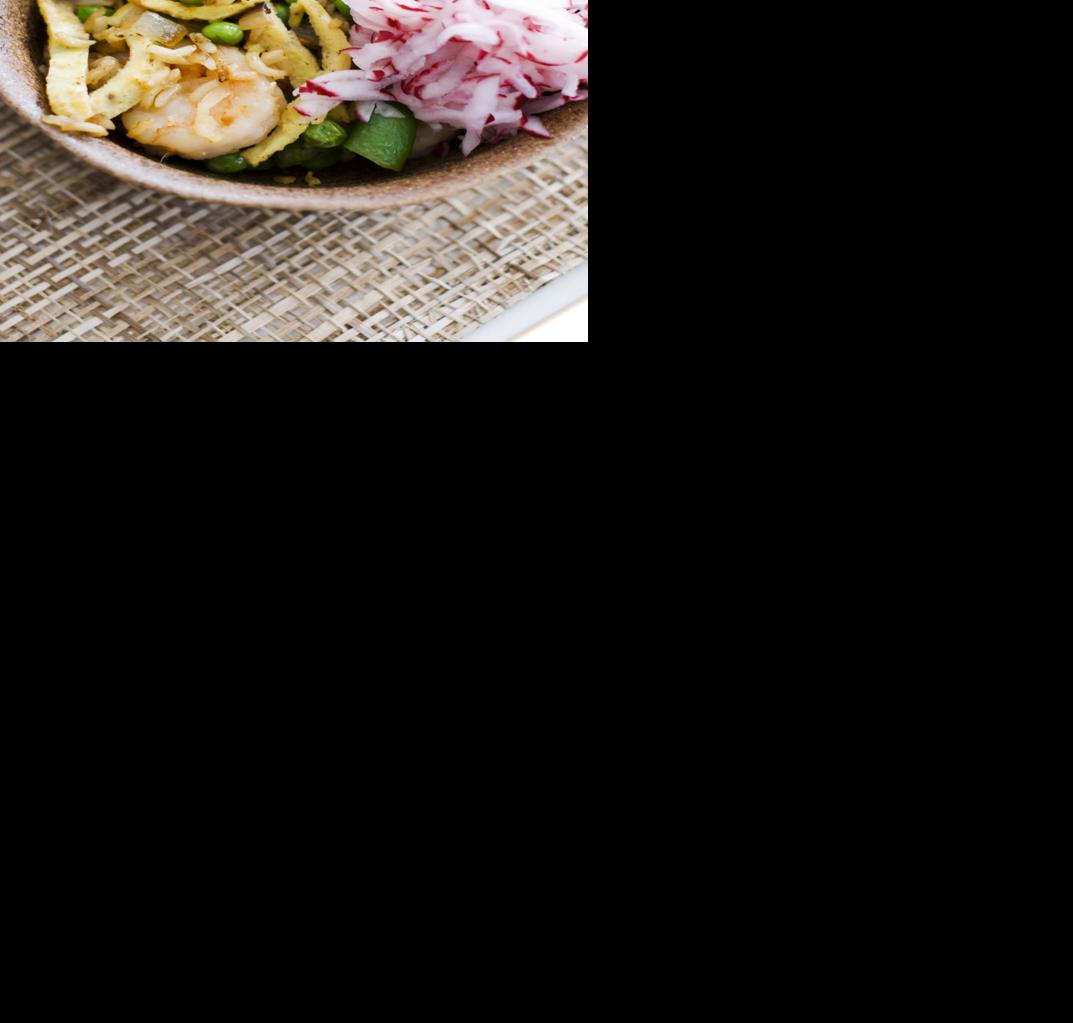 Into this recipe goes good things like shrimp, sugar snap peas and radishes.