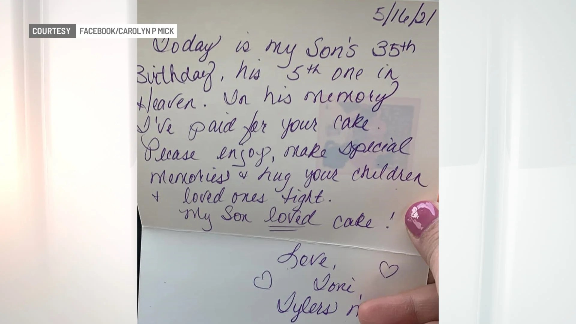 When she arrived, she was told the cake had already been paid for by an anonymous woman who left a note that read: “Today is my son’s 36th birthday. It is his fourth in heaven. I wanted to honor and remember him by paying it forward.” She then wrote, “May you make tons of precious memories to remember for a lifetime. God bless you and yours – James’ Mom.”