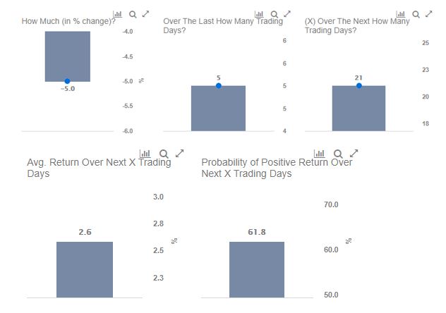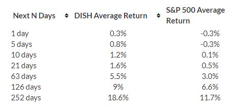 IF DISH stock moved by -5% over five trading days, THEN over the next 21 trading days, DISH stock moves an average of 2.6 percent, with a 62% probability of a positive return.