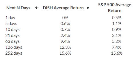 DISH’s returns over the next N days after a 5% change over the last five trading days is detailed in the table below, along with the returns for the S&P500: